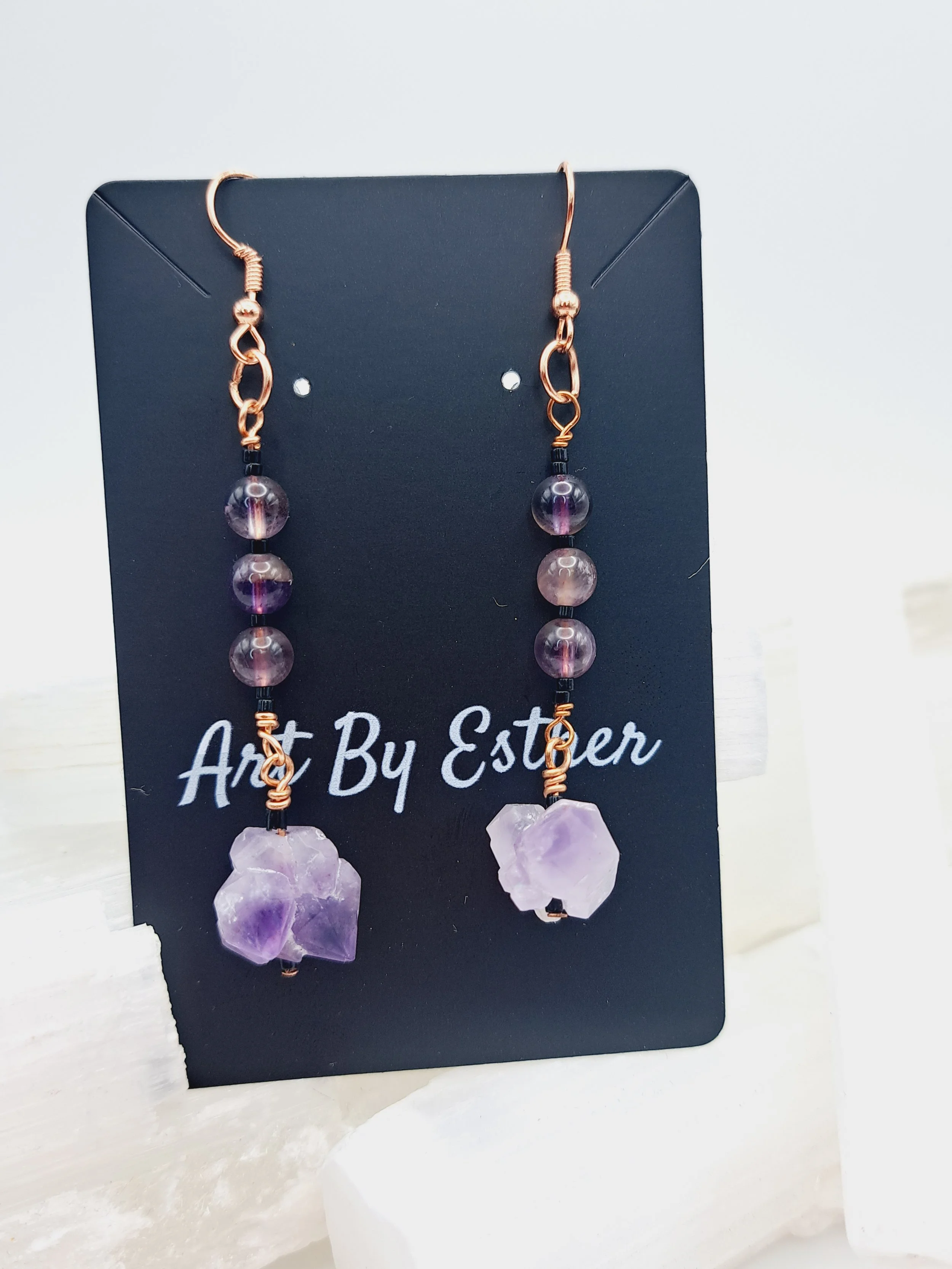 Art by Esther › Dangling Crystal Earrings - style c2 Image 1 of 10 Image 2 of 10 Image 3 of 10 Image 4 of 10 Image 5 of 10 Image 6 of 10 Image 7 of 10 Image 8 of 10 Image 9 of 10 Image 10 of 10 Dangling Crystal Earrings - style c2 $18.00 Your choice of crystal wrapped in copper with artist choice of spacers and flare. Handcrafted by Esther. Crystal: Amethyst Citrine Blue Lace Agate Carnelian Purchase Added! Your choice of crystal wrapped in copper with artist choice of spacers and flare. Handcrafted by Esther.